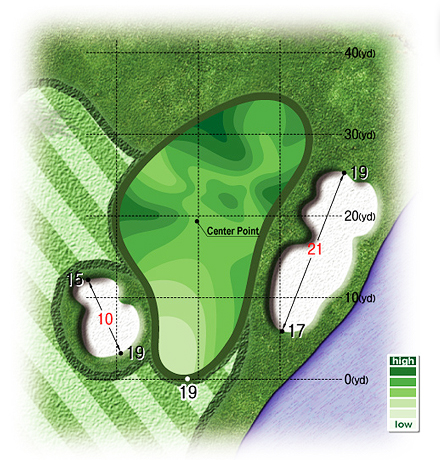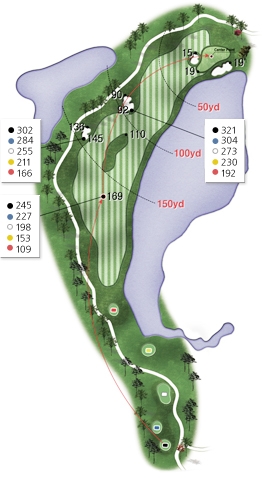This par-4 has a large pond to the right. As there is plenty of space on the left-hand side of the fairway, you should aim for that area without being conscious of the hazard.