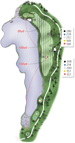 You should aim at the bunker to the right of the green when you hit the tee shot. For your second shot, consider the hazard in front of the green.