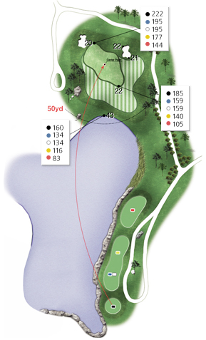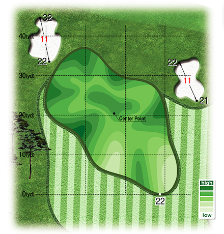 This par-3 is quite long. You must know the location of the pin and be careful in selecting clubs. As the green is very long and it is not easy to measure the distance when putting, you should putt with extreme care.