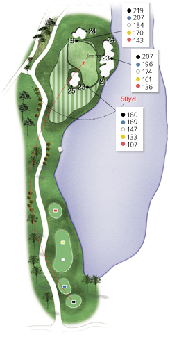 Check the wind. It is advisable to hit a club longer in consideration of the hazard and bunker in front of the green.