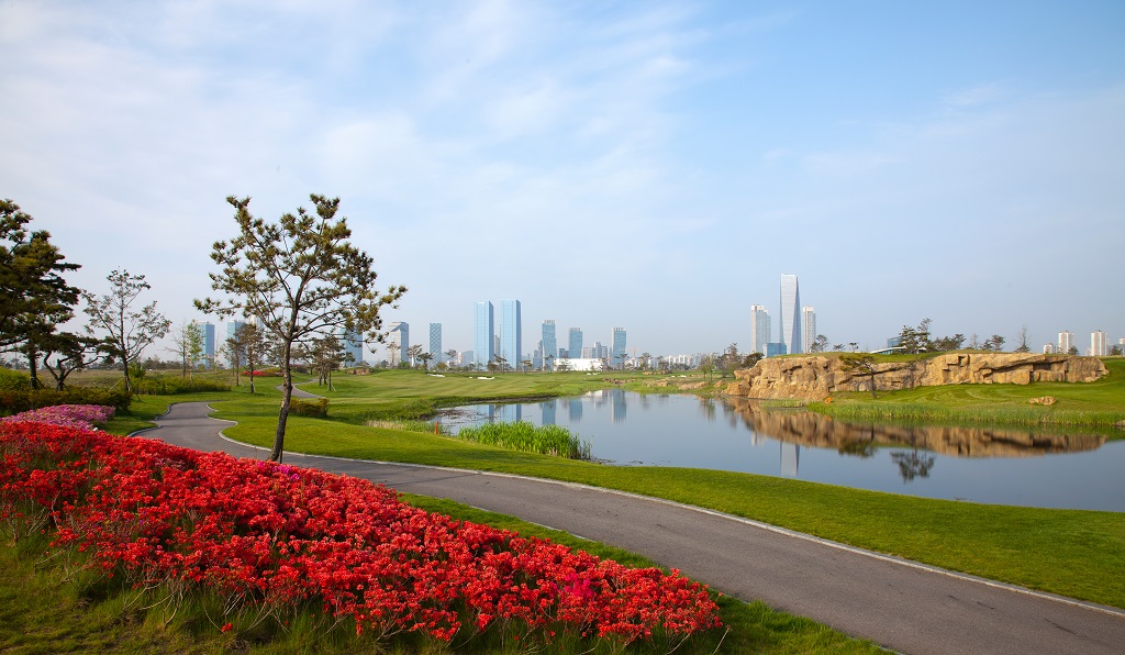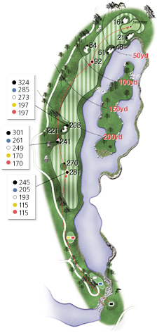 This par-5 has a large pond to the right of the fairway. You should send both the tee shot and second shot to the left of the center while avoiding the hazard to the right so that it will be easier to get on green.