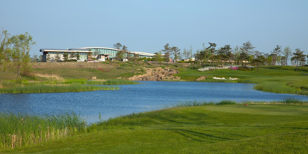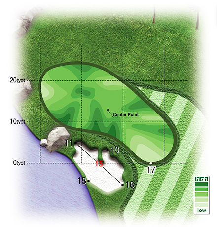 You should aim at the bunker to the right of the green when you hit the tee shot. For your second shot, consider the hazard in front of the green.