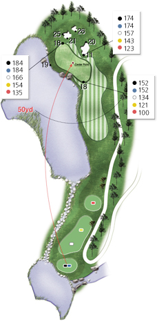 Although this is the shortest par-3 hole, it has the long and wide green. It is advisable to check the location of the pin well to avoid a long and difficult putt.