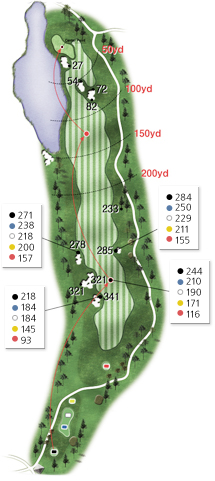 You should hit the tee shot to the right of the fairway. If you hit your second shot to the right of the green, you can land on it in two shots, but an accurate lay-up shot has a better chance for a birdie.