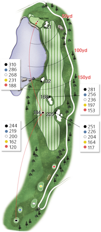 You should hit the tee shot over the fairway bunker on the right. As the fairways lopes downhill, you can hit the second shot from a shorter distance.